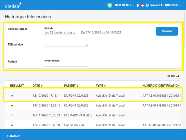 Accédez facilement à l'historique des téléservices dans Stellair : filtrez par période, téléservice ou patient.
