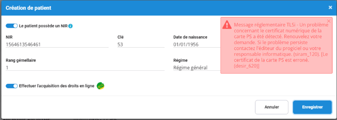 🧾 Vous avez renseigné les informations du patient, mais un message d’erreur en rouge apparaît.